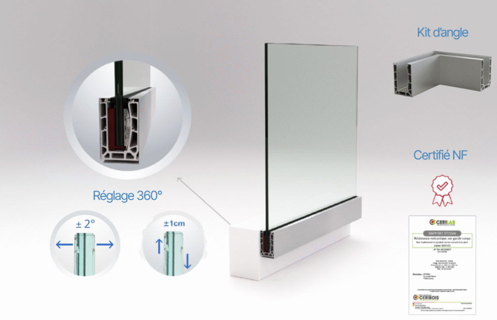 Son verre feuilleté trempé Securit vous assure sécurité et élégance. Il est fourni avec une main courante en aluminium discrète, garantissant un alignement optimal des verres.