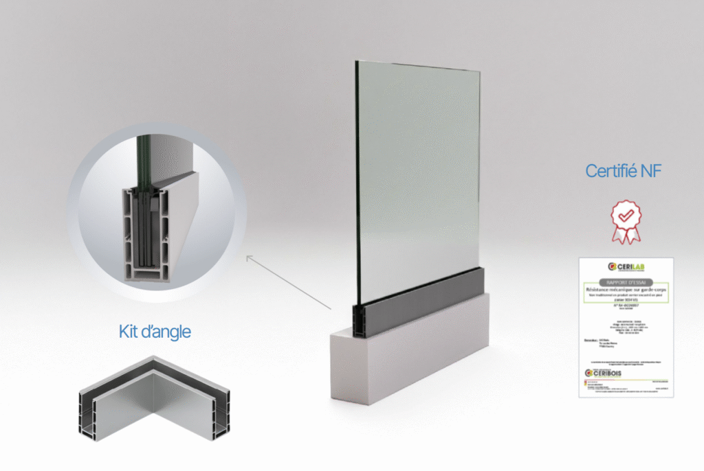 Vendu en barres de 2,5 m, il s’installe à la française, sur une dalle béton ou un acrotère. Sa vis de serrage permet de bloquer le verre en douceur, sans risque de casse.